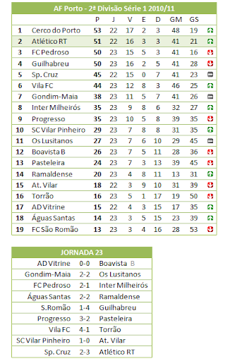 Obs:Classificação corrigida, o Sp. Cruz viu confirmado o castigo de derrota no jogo com o S.Romão do dia 31-10-10 - (9ªJornada).Circular nº 106. >>>>